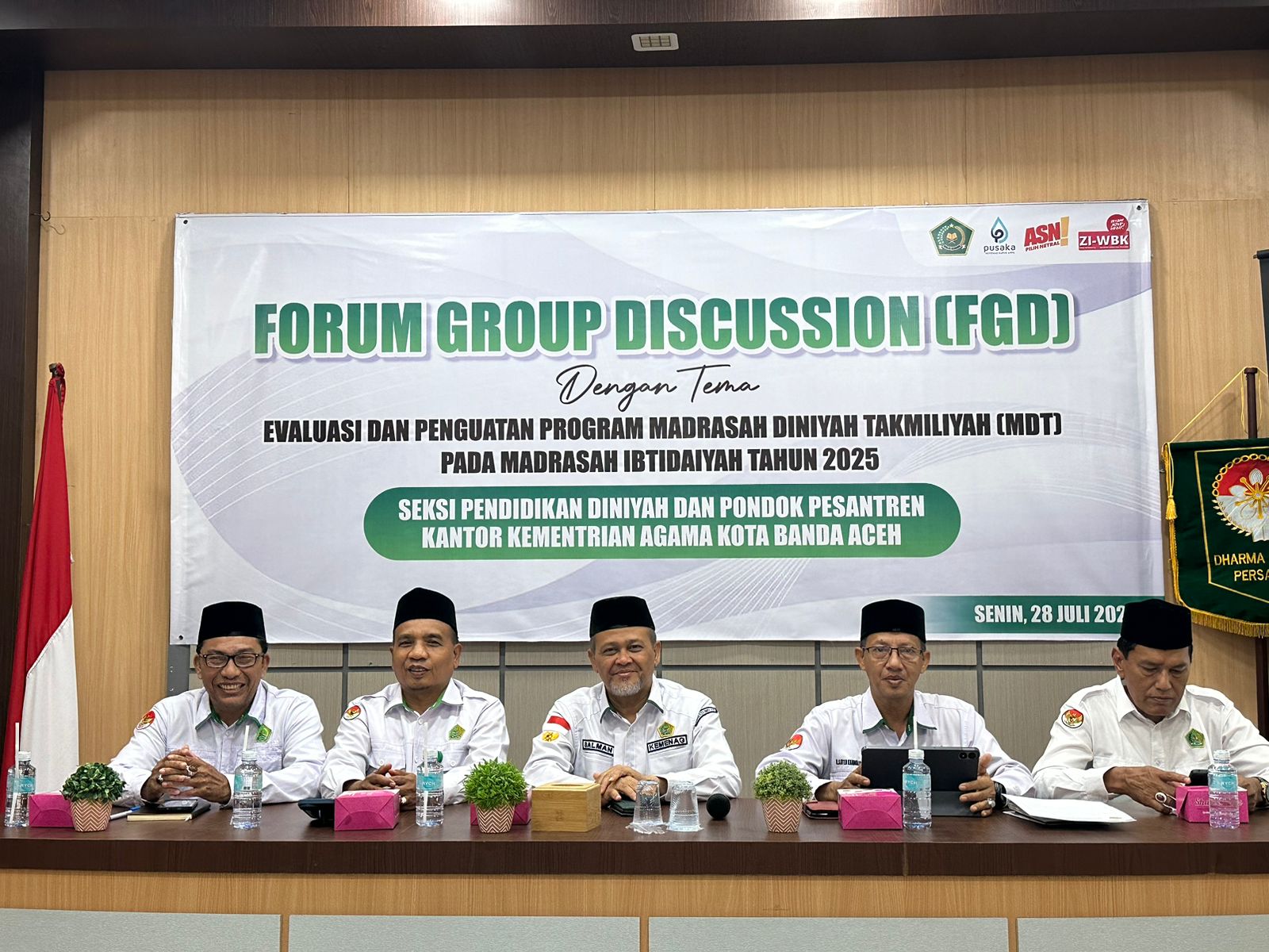 Kantor Kementerian Agama Kota Banda Aceh melalui Seksi Pendidikan Diniyah dan Pondok Pesantren (PD Pontren) menggelar Focus Group Discussion (FGD) bertajuk “Evaluasi dan Penguatan Program Madrasah Diniyah Takmiliyah (MDT) pada Madrasah Ibtidaiyah Tahun 2025”, yang berlangsung di Aula Kantor Kemenag Kota Banda Aceh, pada Senin, 28 Juli 2025.
