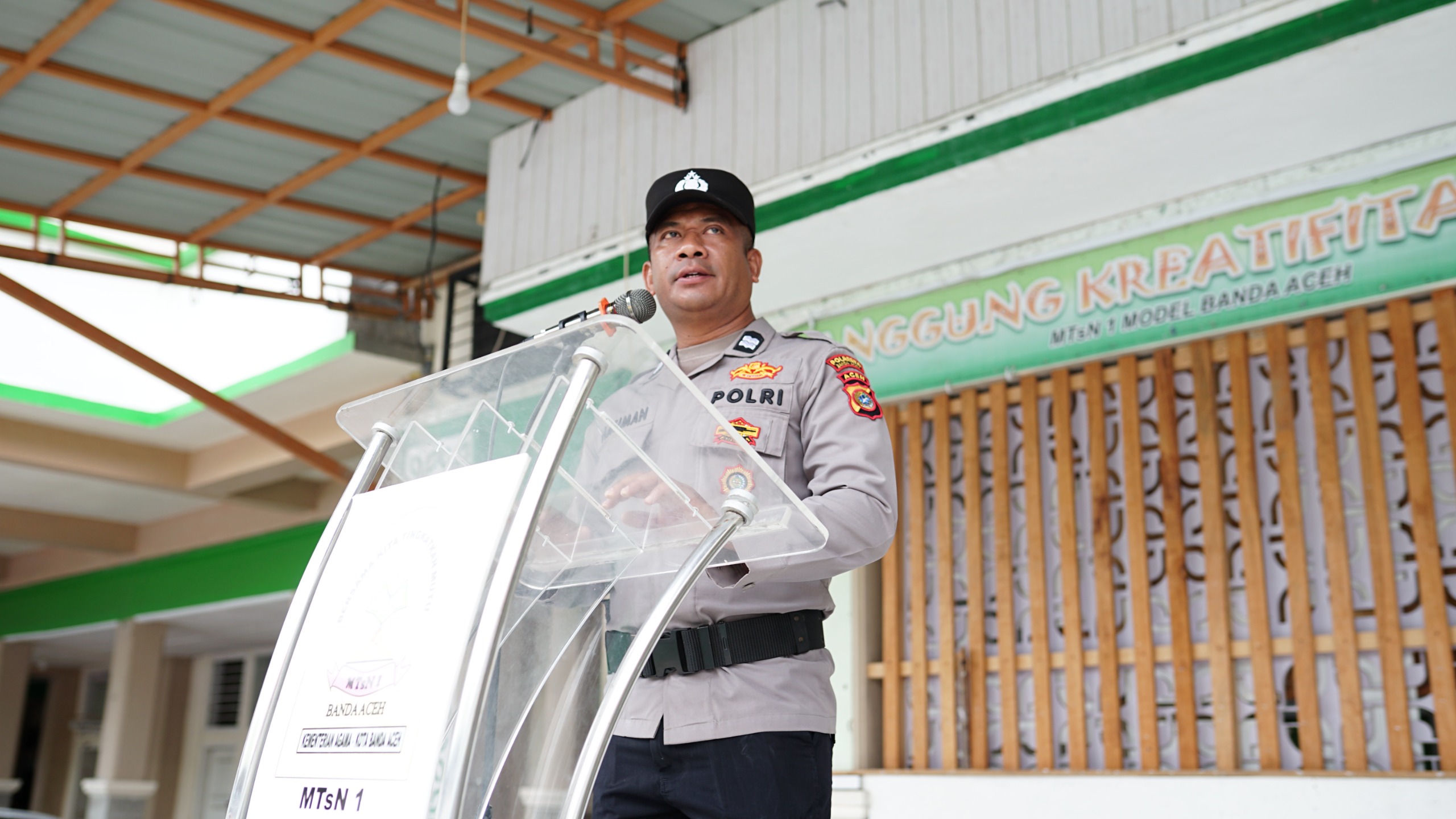 Banda Aceh – Suasana khidmat di lapangan MTsN 1 Model Banda Aceh pada Senin pagi (29/9/2025) diwarnai kehadiran sosok istimewa. Kanit Bimas Polsek Kuta Alam Aiptu Hasiman yang bertindak sebagai pembina upacara bendera, menandai eratnya kolaborasi antara lembaga pendidikan dan aparat keamanan dalam membina karakter siswa.